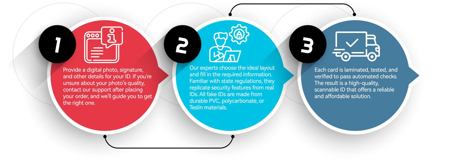 We take our time to create each fake ID, ensuring it meets the quality of a government-issued card. Here’s how we craft your fake ID: